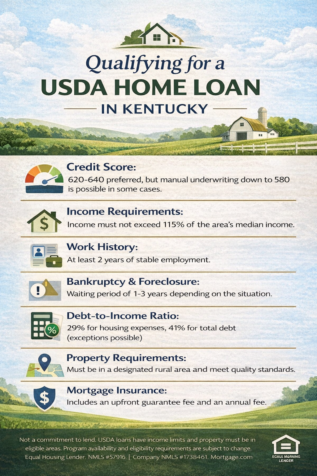 The Kentucky Rural Housing USDA home loan program offers an excellent opportunity for eligible homebuyers in rural and suburban areas of Kentucky to secure affordable financing with no down payment. To qualify, applicants must meet specific requirements related to credit score, income, work history, bankruptcy, foreclosure, debt-to-income ratio, property requirements, and mortgage insurance. Here’s a detailed guide to help you understand these qualifications: