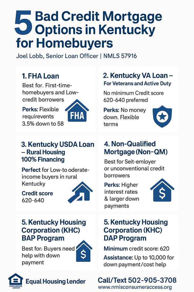 Discover 5 bad credit mortgage solutions in Kentucky. Learn about FHA, VA, USDA, Non-QM loans, and KHC Down Payment Assistance with Joel Lobb, Mortgage Loan Officer.
